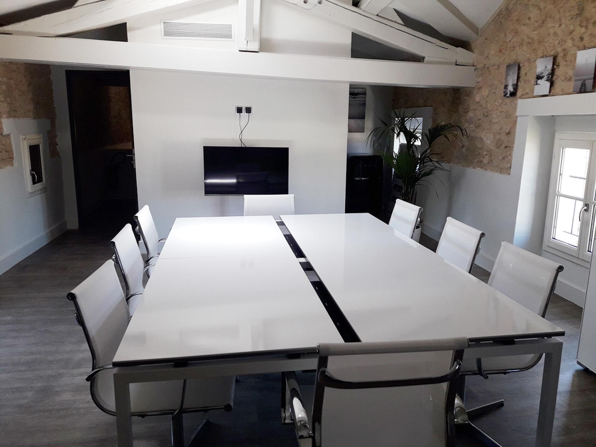 Pour la salle de réunion, nous avons proposé des tables Cinétic avec plateaux double coulissant, permettant une configuration adaptable selon les usages. Le plateau blanc brillant offre une luminosité naturelle à la pièce, et les goulottes d’électrification intégrées facilitent les branchements lors des réunions.